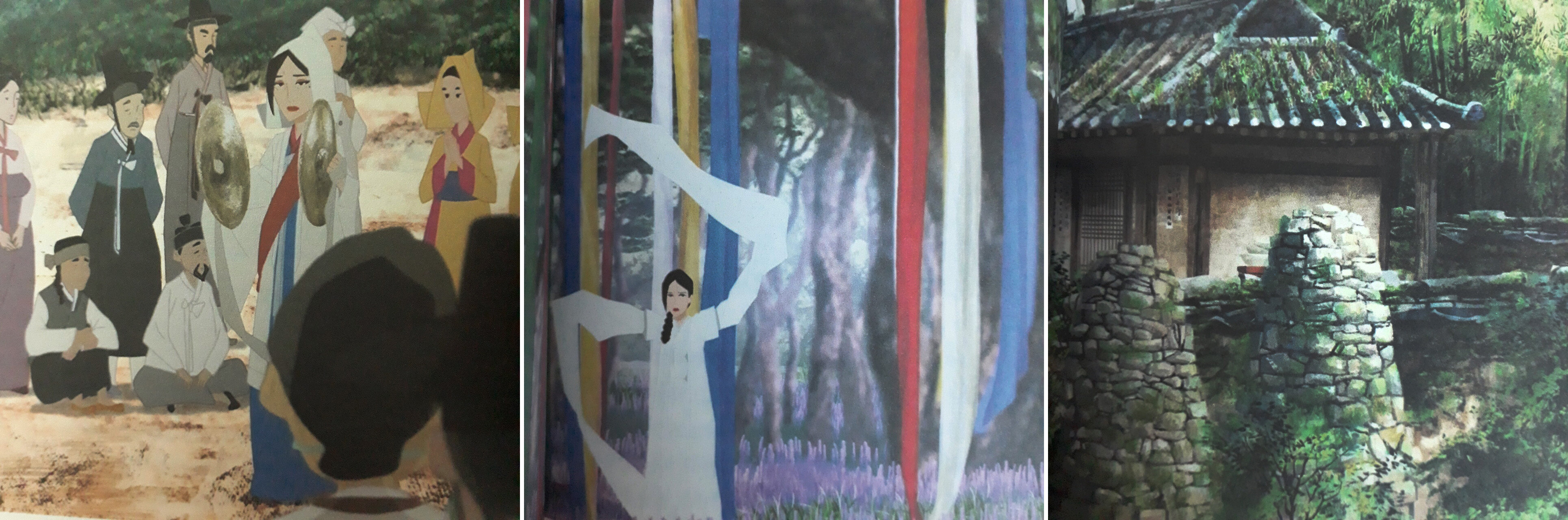 이 책 '애니메이션 현대문학 단편집'은 중·고등학교 교과서에 꼭 포함되는 청소년 필독 한국 현대문학 단편소설 다섯 작품을 안재훈 감독님의 고품격 애니메이션 원화와 함께 수록한 책입니다. 원작 소설과 함께 애니메이션의 장면들이 매페이지마다 펼쳐지는데 사진처럼 섬세하면서 수채화 작품처럼 은은한 멋이 있어서 눈이 호강합니다. 그런데 산과 들, 강의 풍경 묘사는 너무 뛰어나고 마음에 들었는대 봄봄이나 소나기의 캐릭터는 너무 촌스러움이 묻어나는 그림체였어요. 어쩌면 그동안 봐왔던 일본식 애니메이션의 캐릭터에 너무 길들여져있는 탓인 것 같네요. 무녀도의 캐릭터는 완전히 다른 그림체여서 작화의 폭이 굉장히 넓다고 느꼈습니다. 아마 촌스러운 캐릭터는 일부러 그렇게 그린 것 같았습니다.