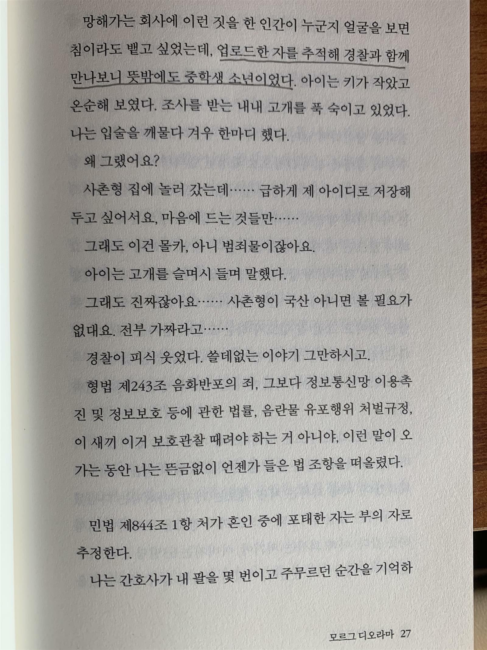 놀라운 것은 소설이 발표된 시점에서 2~3년이 지난 지금 소설 속 일들이 ‘사건화’ 된다는 점이다. 그녀가 가진 예민한 시선으로 건져 올린 지금의 문제는 지금 문제처럼 보이지 않는다. 하지만 곧 모두가 ‘문제’라고인지하는 문제가 된다. 모르그 디오라마를 예로 들어 보자. 그 작품은 2018년 초에 발표된 작품이다. 나는 이 작품을 현대문학상 수상집에서 읽게 되었는데 때는 2018년 연말이었다. 서점에서 올해에 젊은 작가상을 수상하고 현대문학상까지 수상한 박민정 소설가의 책들이 한쪽 매대를 온전히 차지하고 있었다. 젊은 작가상이란 이름이 주는 느낌보다 현대 문학상이란 이름이 주는 느낌은 더 커다랗다. 다들 대단하다고 하니 나도 한 번 읽어볼까?하면서 책을 구매했다. 그리고 그 당시에 소설을 읽고 상을 왜 받았는지 잘 이해할 수 없었다. ‘페미니즘적 시선이 과하게 들어 가 현실적이지 않다.’라고 생각한 듯 하다. 그로부터 1년여가 흐른 시점에 n번방 사태가 터졌다. 매체에서 쏟아지는 뉴스들을 따라가다가 우연히 그녀의 소설이 떠오르게 되었다. 그래서 다시 한 번 속는 셈치고 읽어 보았다. 그런데 지금 현실에서 일어나고 있는 일이 이미 소설에서 씌여져 있었다. 그리고 소설이 비로소 이해되었고 왜 상을 받았는지도 조금 느낄 수 있었다.
