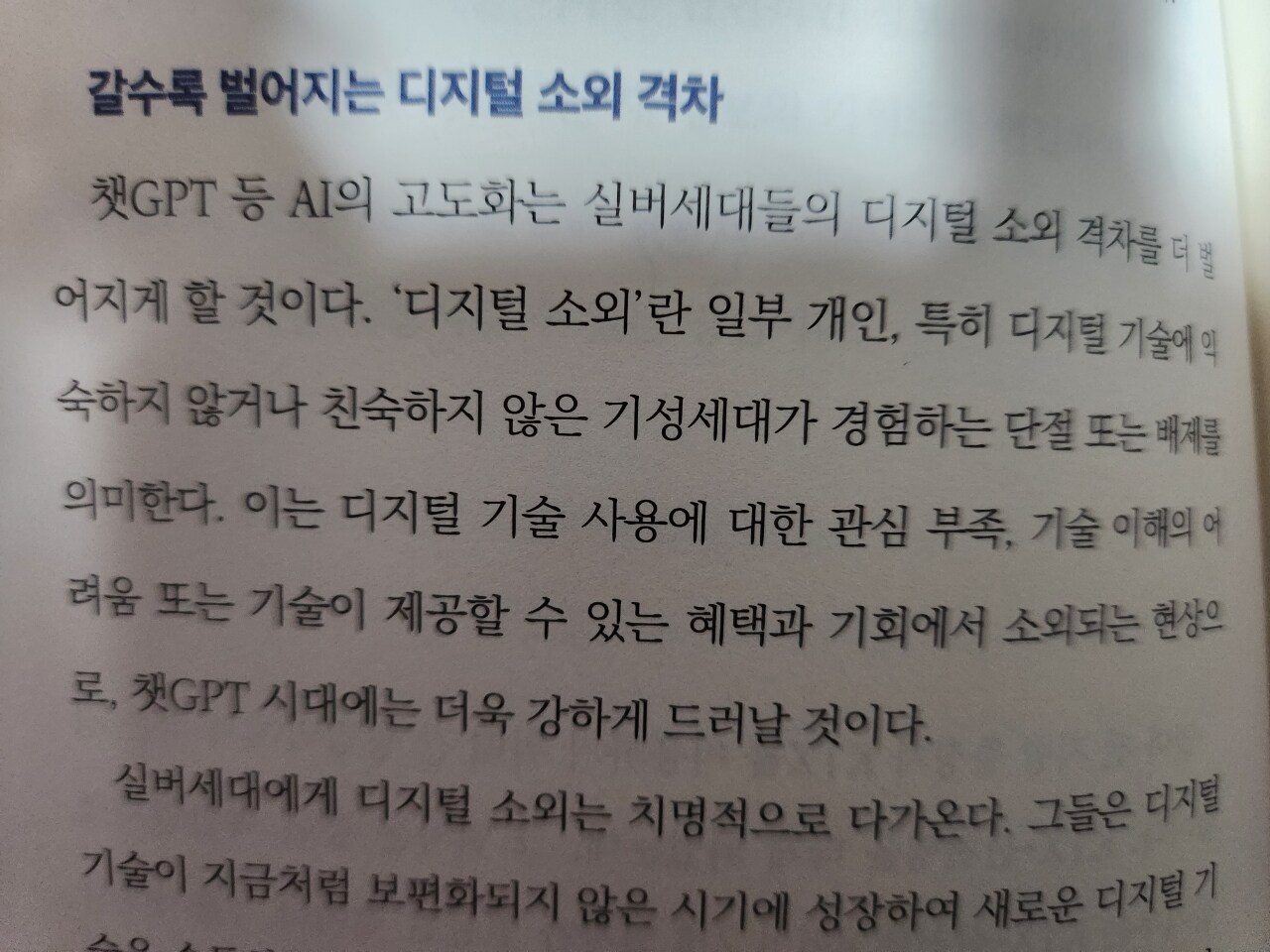 이어서 3파트에서는 챗GPT가 바꾸어 놓은 미래의 교육입니다. 미네르바 대학 등 탈교실화와 평생교육의 일반화가 가속화되고 있으며, 갈수록 벌어지는 디지털 소외 격차를 완화하기 위해 실버세대에 대한 디지털 리터러시(Digital Literacy) 교육을 강화하는 내용입니다.