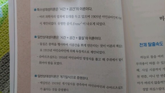 이 책은 총 6개의 장으로 구성되어 있습니다. 1장에서는 우주를 이해하기 위한 필수 이론인 아인슈타인의 상대성 이론에 대한 설명입니다. 우주에서의 중력은 휘어진 시공간이라 할 수 있기에 이를 독자 눈높이에 맞춰 쉽게 설명하고 있습니다.
