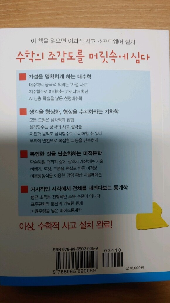 저도 학창시절에는 수학적으로 뛰어나진 못했습니다. 하지만, 세상의 과학기술이 발전하면서 수학의 중요성은 예전보다 더욱 커지고 있고, 대입에서도 수학이 합격을 좌지우지하는 등 큰 비중을 차지하고 있습니다. 이 책은 문과계열 학생이 이과적 사고를 쉽게 장착하도록 씌여졌고, 이 책을 통해 수학적 사고력을 키움으로써 수포자가 생기지 않기를 바라는 마음 간절합니다. 이것으로 저의 백 마흔 아홉번째 서평을 마칩니다. 감사합니다.
