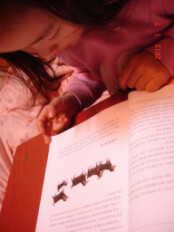 성경을 읽다가 그림을 짚어가면서 어떤 이야기인지 엄마에게 설명해 주고 있습니다.