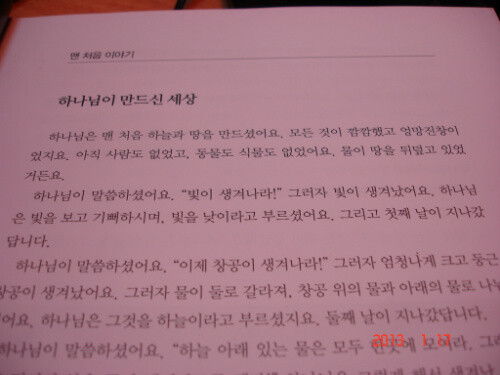 누구나 그렇겟지만 같은 책을 여러 권 소장할 필요는 없고 굳이 성경도 그러하여 주변에 성경을 종류별로 수집하듯 모으시는 분들을 보면 좀 의아했는데 각 출판사별로 출판되는 성경이 같은 성경 이야기를 보여주는 것이 특징이 있어 아이들 책을 엄마가 대할때마다 함께 새로운 가슴 뜨거운 경험을 하곤 했기에 이 책도 그러한 취지에서 만나보게 된다. 한글을 떼고 읽기에 신난 둘째는 자신만의 성경을 준비하여 예배를 드리고 싶었나 보다. 초등학교 입학과 함께 사주려던 엄마의 계획이 많이 부족했음을 생각하게 하는 대목이다. 아이에게 선물하니 너무나 좋아라 한다.