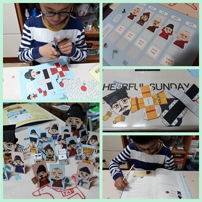 가위로 오려서 위인들을 직접 만들기도 하니
