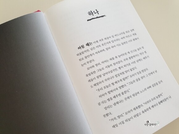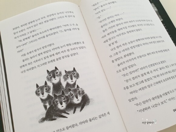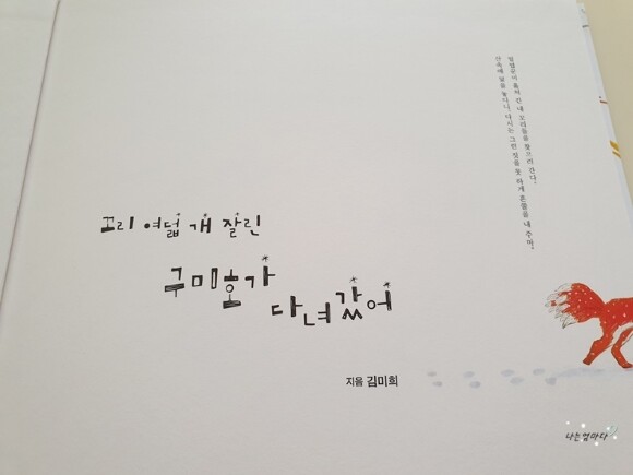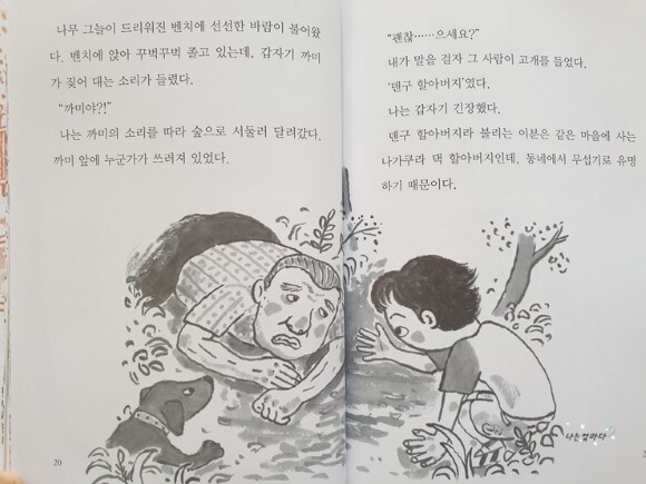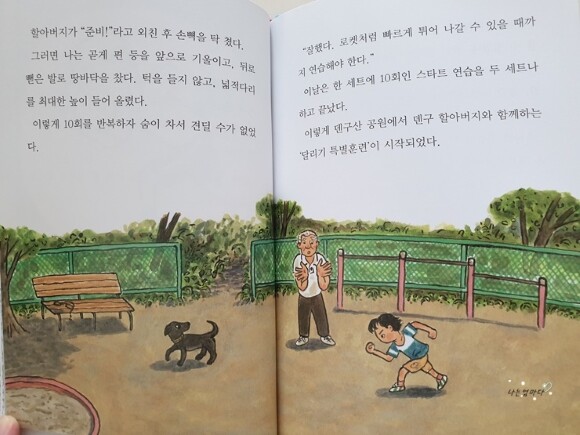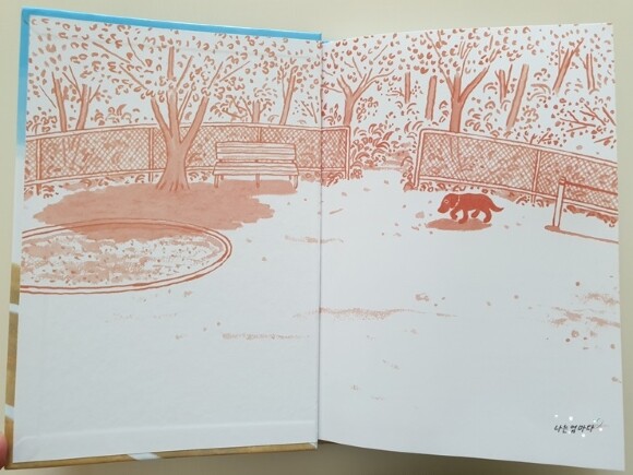 책 표지를 열자마자 보이는 공원 속 강아지 한마리가