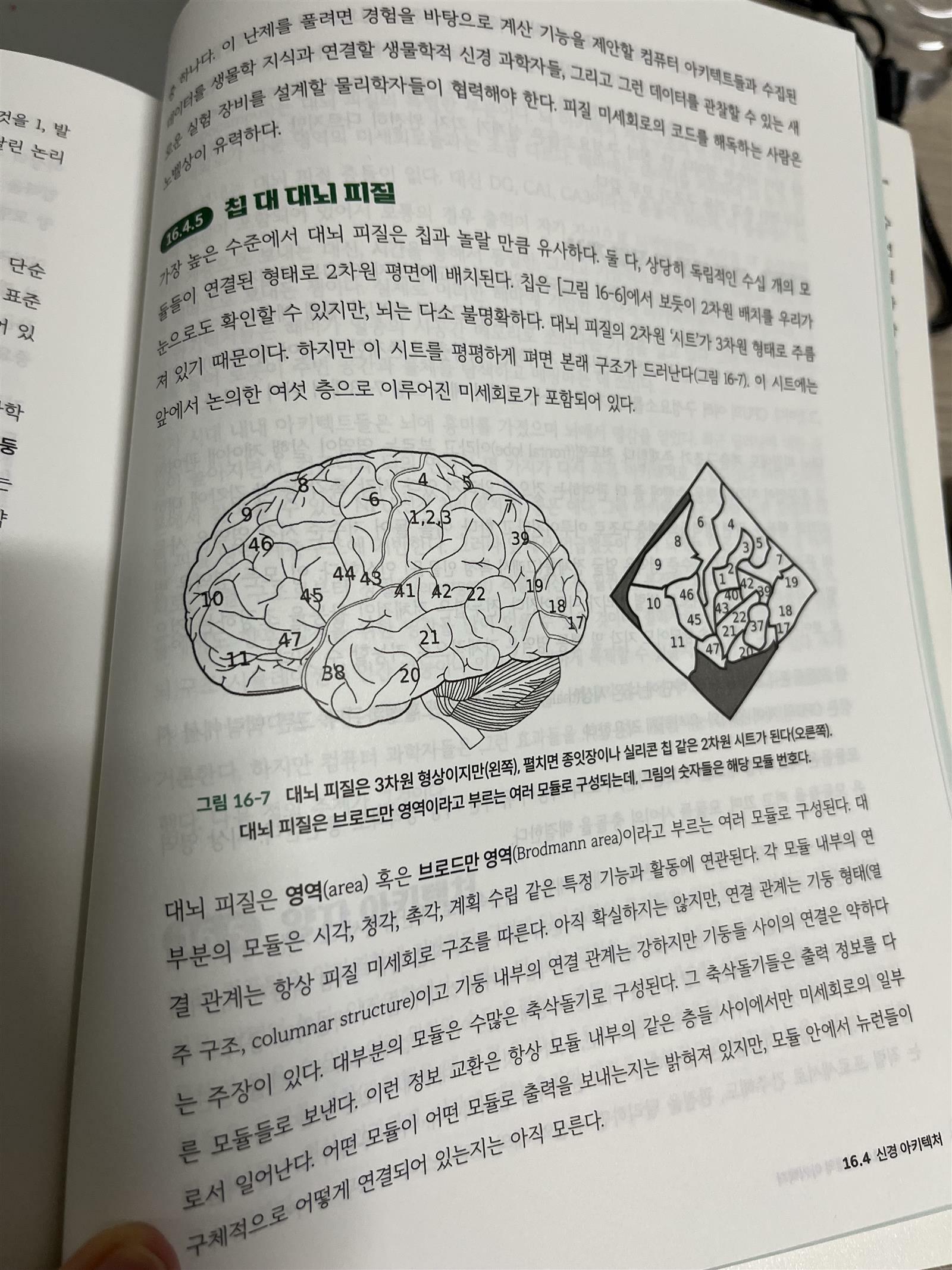 책에 실린 그림은 3차원 주름 투성이인 인간의 뇌를 평평하게 펼쳤을 때(우측), 그것이 마치 2차원 평면 위에 독립적인 모듈(브로드만 영역 등)들이 배치된 실리콘 칩(Wafer)과 유사한 형태가 됨을 보여줍니다. 시각, 청각, 계획 수립 등 기능별로 분화된 뇌의 영역들이 층(Layer)과 기둥(Column) 구조로 연결되어 효율적인 연산을 수행하듯, 미래의 컴퓨터 역시 이러한 생체 모방적 설계를 통해 현재의 폰 노이만 병목 현상을 극복할 것임을 시사합니다. 결국 컴퓨터 아키텍처의 미래는 가장 기계적인 것에서 출발해 가장 생물학적인 것으로 회귀하는, 위대한 융합의 여정이 될 것입니다.