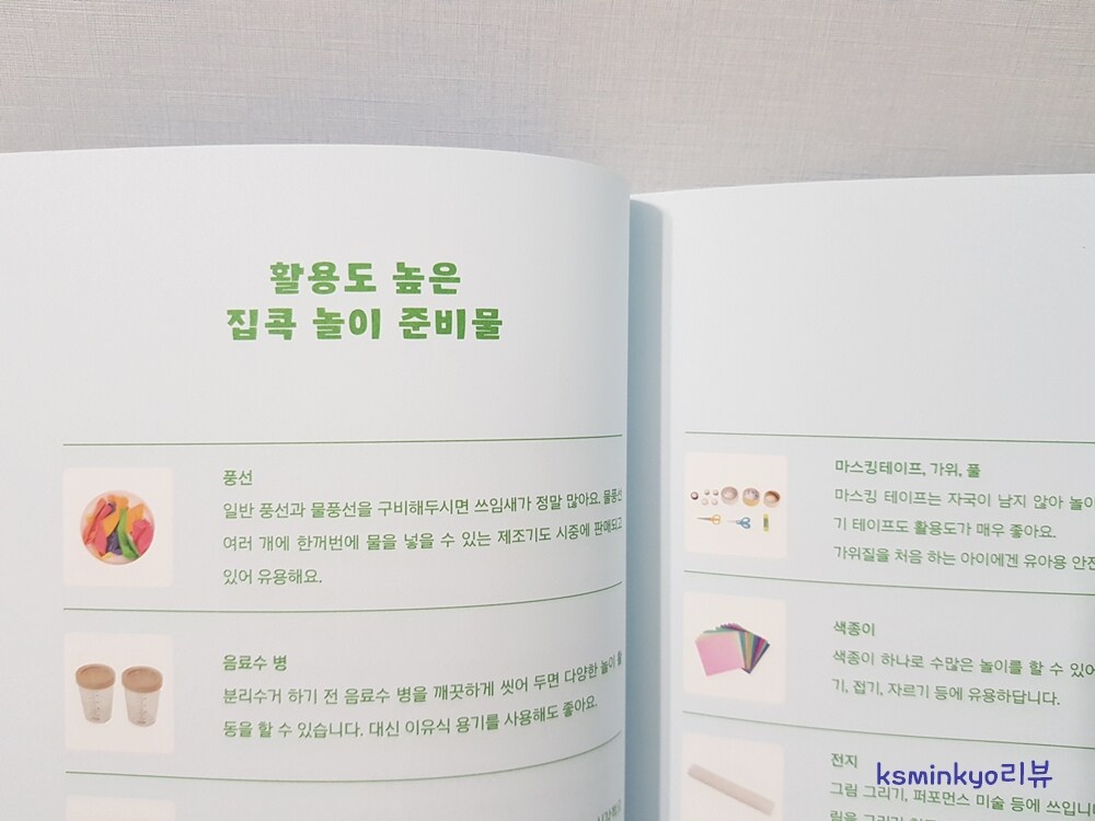 책에서 쓰인 놀잇감들이 책 앞부분에 나오는데 집에서 쉽게 구할 수 있는 재료들입니다.