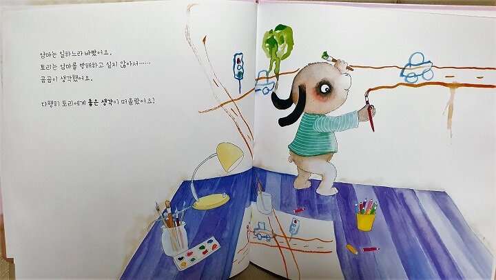 엄마는 일하느라 바빴어요. 토리는 엄마를 방해하고 싶지 않아요. 그래서 좋은 생각이 떠올랐어요. 벽에다 커다랗게 그림을 그리는 것 말이예요.