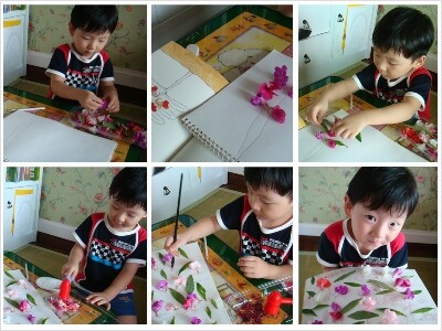 열손가락 빨갛게 물들이는 대신 스케치북은 연한 꽃물로 물들여봤어요~