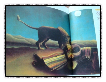 잠자는 집시 여인과 사자, 병, 만돌린을 그리고 색칠하고, 오려서 붙여요.