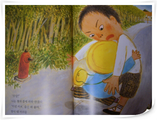 어느 날, 형이 유치원에 동생을 데리러 왔는데 가방도 들어주지 않고 쏜쌀같이 골목길을 돌아가버린다. 동생은 형을 부르지만 갑자기 큰 개가 짖어 놀라 도망쳤더니 처음 와보는 잡목길에 서 있게 된다.동생은 형이 보고 싶어 그동안 형이 자기에게 큰소리치고 '겁쟁이 울보'라고 했던 일을 떠올리며 그렇게 해도 좋다며 형을 애타게 찾는다. 그 순간 '와악!'하는 소리에 돌아보았더니 형이 서 있는 것이다. 울면서 형에게 와락 안기는 동생 모습이 넘 이뻤다. 얼마나 무서웠을까? 어린 마음에 낯선 곳에 혼자 있어서 더 무서웠을 것이다.
