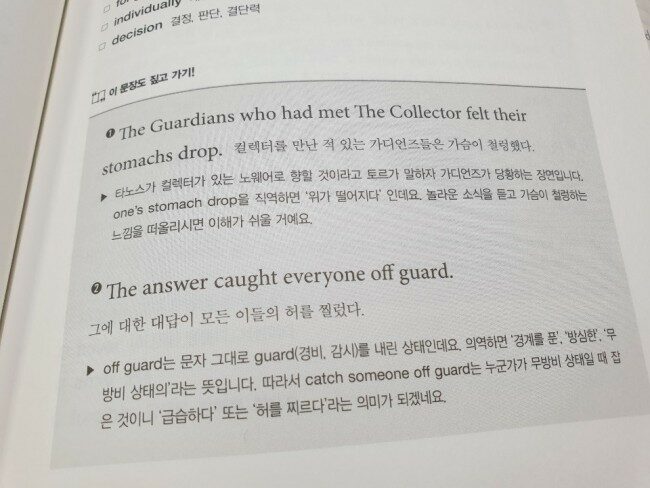 off guard는 문자 그대로 경비, 감시를 내린 상태를 말하는데요. 의역하면 '경계를 푼','방심한','무방비 상태의'라는 뜻이래요. 그래서 catch someone off guard는 누군가가 무방비 상태일 때 catch 했으므로 '급습하다' 또는'허를 찌르다'라는 의미가 된데요. 워크북 덕분에 알게 되는 게 많아요.