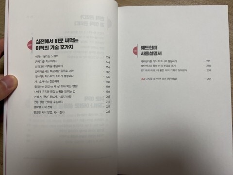 1장 이직은 선택이 아닌 필수다 / 2장 현직 관리가 곧 이직 관리다 / 3장 쉬운 이직 그러나 어려운 성공 / 4장 실전에서 바로 써먹는 이직의 기술 12가지 / 5장 헤드헌터 사용설명서   총 5장으로 되어있고, 이직을 희망하거나 이것에 고민이 많은 분들은 이 도서와 함께하면 소중한 시간과 기회가 될 것이라고 생각한다.