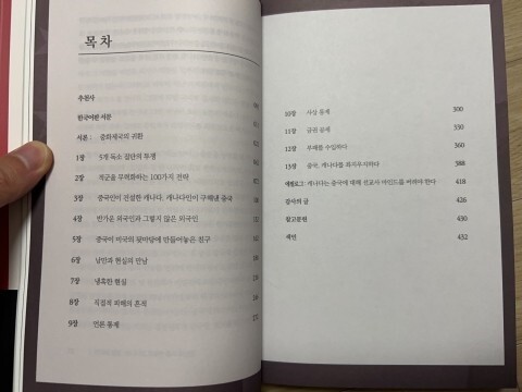 3장 중국인이 건설한 캐나다, 캐나다인이 구해낸 중국 / 4장 반가운 외국인과 그렇지 않은 외국인 / 5장 중국이 미국의 뒷마당에 만들어놓은 친구 / 6장 낭만과 현실의 만남 / 7장 냉혹한 현실 / 8장 직접적 피해의 흔적 / 9장 언론 통제 / 10장 사상 통제 / 11장 금권 공세 / 12장 부패를 수입하다/ 13장 중국, 캐나다를 좌지우지하다   총 13장으로 구성되어있고, 중국 공산당의 본질과 실체를 정확하게 파악을 할 수 있는 소중한 기회와 시간이 될 것이라 생각이든다.