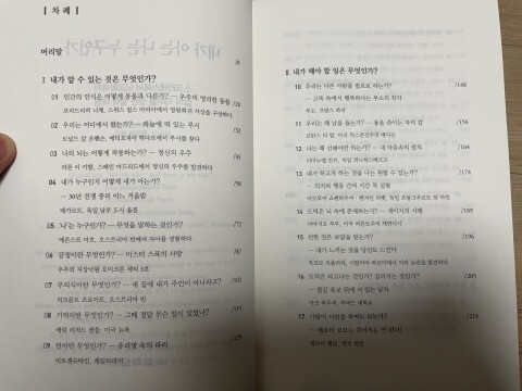 총 3파트로 34강의 주제로 구성되는데, 우리가 인생을 살아가면서 해보았을 고민들이 최소한 한 가지 이상은 있을 것이고, 그 고민을 해결하는데 조금이나마 도움이 될 수 있을 것이라는 생각이 들었다.