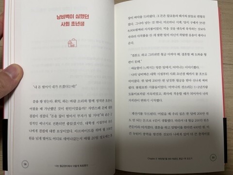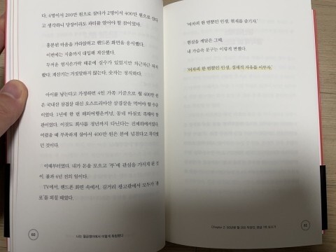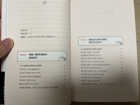 목차를 알면 이 책의 내용과 컨셉 그리고 흐름을 한 눈에 파악할 수 있다. Chapter 1. 특명, 자본주의에서 살아남기 / Chapter 2. 90년생 월 200 직장인, 현금 1억 모으기 / Chapter 3. 5년에 20억, 현실 재테크로 자산 퀀텀 점프 / Chapter 4. 콘텐츠 투자, 새로운 부의 미래 / Chapter 5. 나만의 경제적 자유 지도 그리기   총 5챕터로 이루어져있다. 마치 이 책을 다 읽고난다면, 나도 이렇게 돈을 모을 수 있을까? 하는 기대감과 자신감이 부풀어 오를 것이라는 느낌이 팍팍 들것이다.