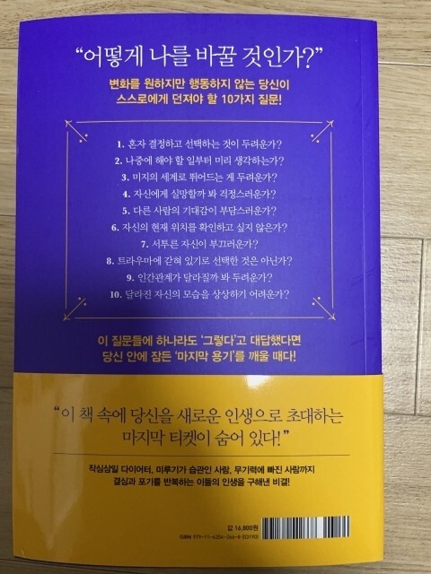나를 바꾸려면 결심도 필요하지만 이를 실행할 수 있는 용기도 필요하다고 본다. 항상 새해가 다가오거나 그 직전에 버킷리스트를 작성하곤한다. 다이어트, 금연, 금주, 그 밖의 계획 등등. 그런데 문제는 작심삼일이거나 또 실행을 하지않는다는 것이 가장 큰 문제다. 분명 달라지고 싶고, 더 나은 삶을 살고 싶은 마음이 있기에 이런 결심을 한 건 분명한 사실이지만. 결국에는 나중에 결과적으로 볼 때는 어떤 것에 도전하는 것이 도돌이표가 되고 마음속 현 켠에는 자신감이 떨어지고 무기력해지기 마련이다. 이럴 수록 마음을 다잡고 다그쳐서 강단있게 뚝심있게 밀어붙이는 용기가 필요하다. 그 조금의 용기도 없어서 기회를 놓칠 수도 있는 것이다. 이 책의 저자는 로스 엘런혼(Ross Ellenhorn) 사회학 박사, 사회복지사, 심리치료사시다. 희망의 두려움이라는 문제를 포착해서 삶의 쉽게 바뀌지 않는 이유를 해결하셨고, 실험을 통해서 그 효과도 입증하신 분이다. 인생이란 우리가 내린 결정과 그 결정에 전념하고 끝까지 실행한 용기의 결과물이라고 말한다. 나 역시도 이 부분에 깊이 공감했다.