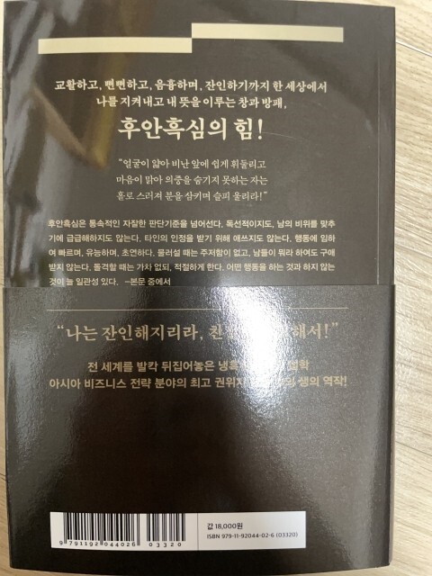 대표적으로 이 부분을 꼽아보았다. 여러분은 승리의 기회를 내가 스스로 쟁취해서 얻는 것이라고 보는가? 그런데 반대로 적이 제공한다고한다. 일은 꾸미는 건 사람이지만, 성패는 하늘이다. 이런 말이 있다. 최선을 다한 다음 조용히 결과를 기다리는 자세가 필요하다. 운명은 정말 아무도 모르는 것이다. 그래서 납득도 할 줄 알아야하고, 포기도 할 줄 알아야한다. 그 둘은 결국에 미묘하고 복잡한 운명의 실타래 속에서 나오는 것이기 때문이다. 책에는 많은 일화와 에피소드가 있다. 그 내용들을 후안흑심의 철학의 잣대에서 적용하고 분석해서 행동과 처세술, 성공을 알려준다. 감정적으로 표출해서 충동적인 모습이 아닌 인내하고 때를 기다리는 모습. 이런 모습이 더 무섭다고 생각한다. 무릇 리더의 모습도 이러한 면모가 있어야한다고 본다. 후안흑심으로 인내의 놀라운 면을 볼 수 있으면서, 돈의 의문점도 풀 수 있다. 노력의 가치를 무시하는 건 아니지만, 노력만한다고 무조건 잘 풀리는 건 아니다. 그런 맥락에서 후흑을 재발견하고 인생의 채워질 수 없는 갈증을 무조건적으로 해소하려해서는 안된다. 내용이 불편할 수는 있어도 인생의 진실에는 눈을 뜨게한다. 마치 쓰디쓴 약같은 처세술이다. 살면서 이보다 더 쓴맛도 보게 될텐데, 미리 예습을 한다고 생각한다면 더 마음이 편할지도 모르겠다.
