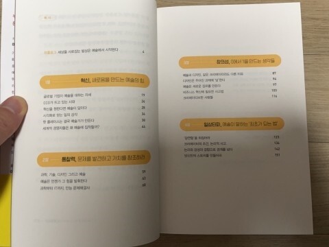 목차를 알면 이 책의 내용과 컨셉 그리고 흐름을 한 눈에 파악할 수 있다. 1장 혁신, 새로움을 만드는 예술의 힘 / 2장 통찰력, 문제를 발견하고 가치를 창조하라 / 3장 창의성, 0에서 1을 만드는 생각들 /
