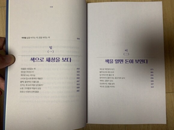 목차를 알면 이 책의 내용과 컨셉 그리고 흐름을 한 눈에 파악할 수 있다. 색으로 세상을 보기 / 색을 알면 돈이 보인다 / 색으로 운명을 바꾼다 / 운을 부르는 색 총 4가지의 대주제로 구분된다. 목차만 보아도 충분히 구미가 당기고, 꼭 보고 싶게끔 만들게한다.