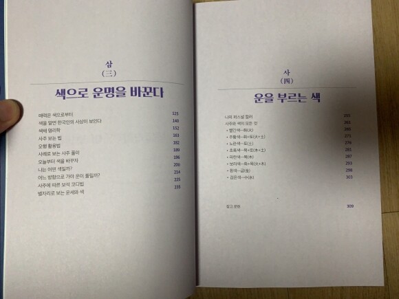 사주팔자가 우리나라에만 발달한 줄 알았는데, 서양도 색의 인식이 있다는 점도 주목해야한다고 보았다. 사주풀이나 색깔이 무조건 100% 일치한다고 할 수는 없다. 그렇지만 한 귀로 흘리기에는 과학적인 요소가 분명히 있다는 점도 중요하다고 생각한다. 확률이지만 알아서 손해볼 건 없다고 본다. 우리가 살아가면서 분명 도움이 되는 부분이 있을 것이다. 나에게 어떤 사주인지? 파악을 하고 그 사주와 어울리거나 균형이 맞는 색채까지 안다면 금상첨화가 아닐까? 책이 엄청 두꺼워서 놀랐다. 사주팔자에 관심이 있으신 분들은 이 책을 주의깊게 기울여서 보았으면 좋겠고, 개인의 사주에 대해서 관심이 있다면 해당되는 부분이라도 꼭 참고를 하면 될 것이라본다.