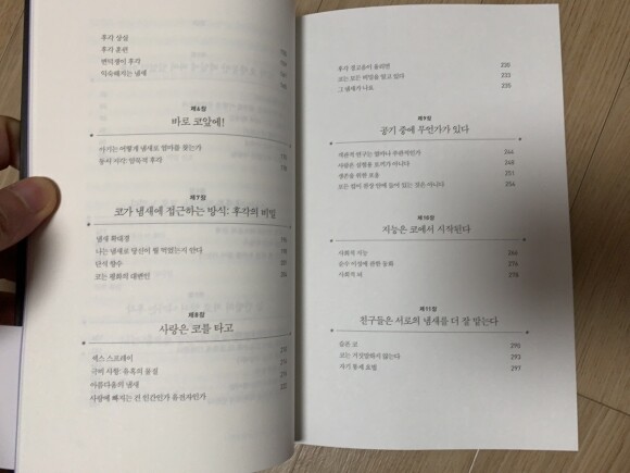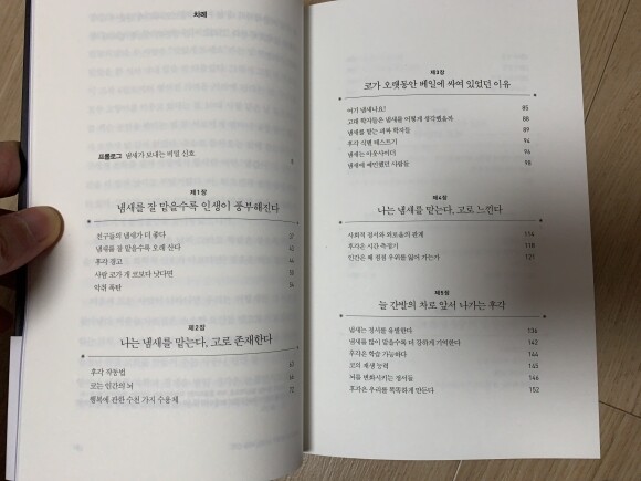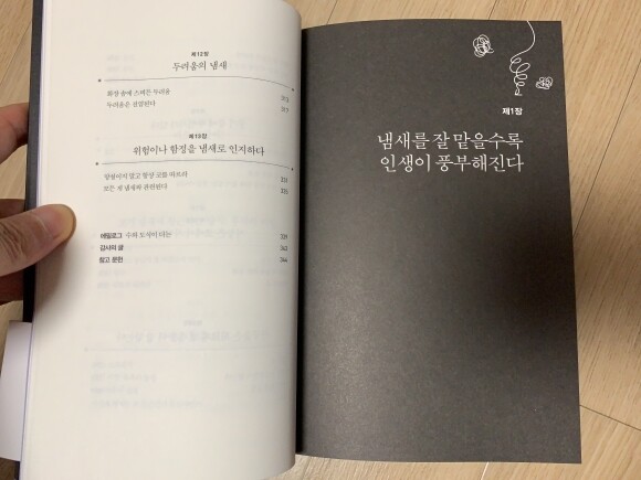 목차를 알면 이 책의 내용과 컨셉 그리고 흐름을 한 눈에 파악할 수 있다. 풍부해 질 수 있는 인생 / 냄새를 맡기에 존재하는 이유 / 오랜기간 베일에 쌓인 코 / 냄새를 느끼는 코 / 후각의 간발의 우월성 / 후각의 비밀 / 사랑을 타는 코 등 총 13가지의 주제로 구분이된다.