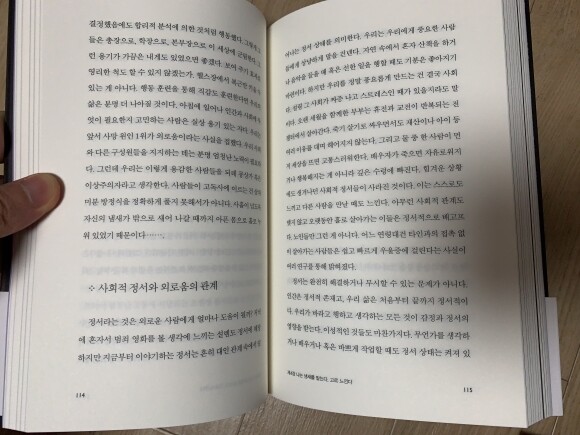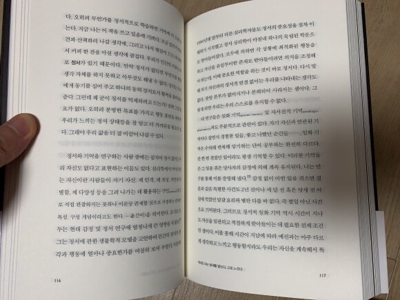대표적으로 나는 이 부분이 눈에 들어와서 사진으로 꼽아보았다. 인간은 사회적 동물, 존재다. 외로움을 느끼는 건 당연한 것이다. 나 역시도 요즘에는 그렇다. 어쩌면 우리가 인간인 이유가 정서가 있기 때문이 아닐까? 생각해본다. 정서가 없다면 감정적인 동물이 아닌, 그냥 냉혈동물에 불과하다. 우리가 생각을 표현하는 매개체가 정서라고본다. 그리고 인간은 사회의 구성원이고 홀로 살아갈 수는 없는 존재이기에 그틈에서 연결고리가 정서이지않을까? 나는 그렇게 보았다. 비록 독자들에게 책을 쉽게 쓰여졌다하더라도, 심리학 전공자가 아닌 문외한인 나로서는 바로 한 번에 이해가 가기는 쉽지가 않았다. 상식선에 기대어서 읽었던 부분도 있었다.