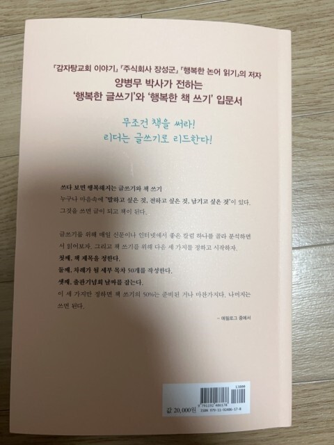 솔직히 책을 한 권 쓴다는 것이 쉬운 건 아니고, 아무나 쓰는 것도 아니라는 것으로 알고 있었다. 예를 들어서 소설도 저명한 소설가나 글쓰기에 소질이 있는 분들만이 가능한 것으로 생각했다. 그런데 요즘에는 자기계발 차원에서 책을 읽으면서 자기도 책을 써보고 싶은 분들과 그것에 도전하고 싶은 분들이 증가하는 추세라고한다. 그런 현상을 강조하는 것인지는 모르겠지만, 저자를 포함해서 책을 쓰거나 글을 쓰는 것은 누구나 다 할 수 있다고 강조한다. 그럼에도 불구하고 책을 쓴다는 것 자체가 그 희망 앞에 거대한 장벽이 서있는 느낌인 것 같았다. 우선 이 책의 저자는 양병무 선생님이시다. 재능교육 대표이사, 인간개발연구원 원장, 서울사이버대학교 부총장 등을 역임하였으며 현재 행복경영연구소 대표이자 책과글쓰기대학 학장으로 활동 중이시다.
