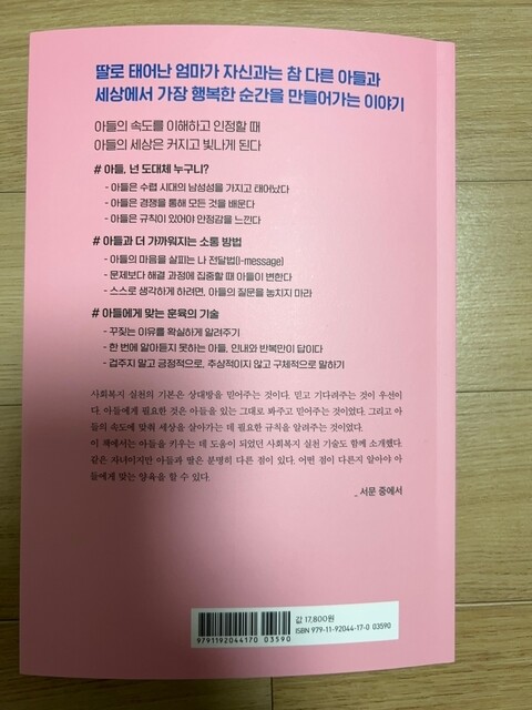 1장 아들이란 무엇인가? / 2장 아들의 감성 지수를 높이는 법 / 3장 아들과 가까워지는 소통 방법 / 4장 아들에게 맞는 훈육의 기술 / 5장 마음이 단단한 아들로 키우는 교육법 / 6장 아들을 위한 세상살이 교육법 총 6장으로 구성된다. 교육법에 있어서 고민이 있거나, 이런 상황이 닥쳐오는 분들에게는 분명 도움이 될 것이고 소중한 시간과 기회를 갖게 될 것이라 생각한다.