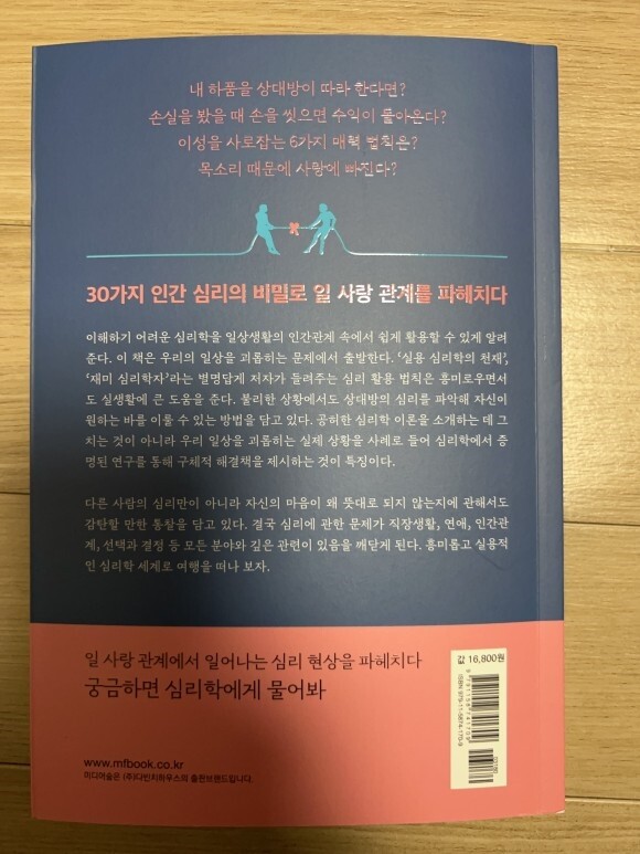 한국어를 전공하셨다고하니, 한국인에게 눈맞춰서 이해하기 쉽게끔 지으셨을 것이라 기대감이 생기게한다. 목차를 알면 이 책의 내용과 컨셉 그리고 흐름을 한 눈에 파악할 수 있다. PART 1 후회 없는 결정, 나도 할 수 있다 - 결정의 심리학 / PART 2 정글 같은 직장에서 살아남기 - 직장의 심리학 / PART 3 이성의 마음을 사로잡는 기술 - 연애의 심리학 / PART 4 몸의 단서로 상대를 꿰뚫어 본다 - 행동의 심리학 / PART 5 외모가 말해 주는 비밀 - 외모의 심리학 총 5파트로 구성되며, 심리학에 대해서 그리고 어떻게 적용을 할 수 있는지?를 배울 수 있는 소중한 시간과 기회가 될 것이라 믿어 의심치않는다.
