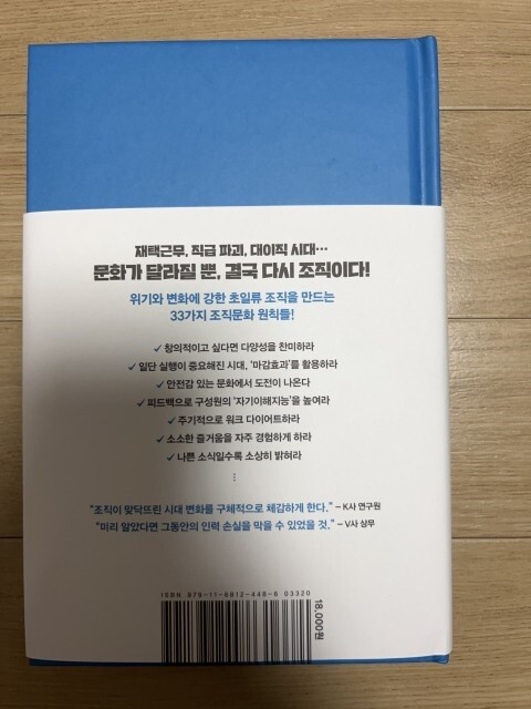 코로나 이후 회사 or 조직 환경이 예전과는 비교할 수 없을 정도로 바뀐 곳도 분명 있을 것이다. 물론 시대나 트렌드에 따라서 변화가 따르는 건 불가피하다는 사실을 잘 알지만, 그 변화의 간극이 커지면 커질수록 확실한 대응방식이 필요하다고 생각은한다. 게다가 조직의 구성원도 따져봐야할 요건 중 하나다. 특히나 세대차이. 요즘에 MZ라는 말이 자주 대두된다. 디지털 전환의 시대인데, 세대끼리 서로 융합하고 조직의 성과를 좋게 도출해야하는데 그것이 쉽지않는 현실이 점점 짙어지고 있다. 그렇지만 얼마든지 방법도 있고, 그리고 성공햇던 기업들이 어떤 원칙을 적용해서 이끌어냈는지의 사례도 나와있기에, 얼마든지 벤치마킹을 해도 나쁘지는 않을 것이다. 게다가 이 도서에서는 33가지 조직문화의 원칙을 제시하고있다. 물론 일을 하면서 대다수가 행복하지는 않을텐데, 그래도 조금이나마 소소하게 행복을 느낄 수 있다면 그 구성원도 좋은 조직문화에서 행운이 아닐 수 없다.