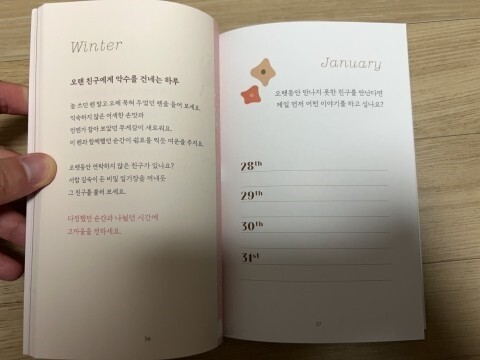총 4장이며 겨울부터 시작해서 봄, 여름, 가을로 간다. 내 자신에게 스스로 위로받고 싶거나 그 방법을 할 수 있는 소중한 시간과 기회를 갖게 될 것이라 믿어 의심치않는다.