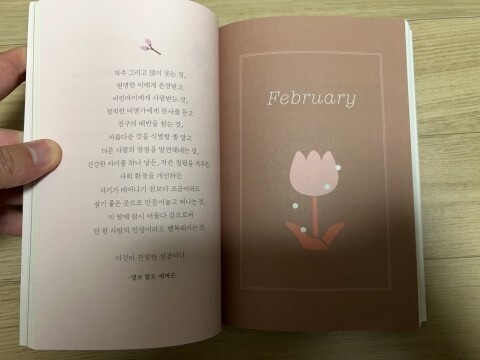 목차를 알면 이 책의 내용과 컨셉 그리고 흐름을 한 눈에 파악할 수 있다. Winter 나에게 한 걸음 다가가기 / Spring 나의 하루를 지지하기 / Summer 마음을 다해 나를 믿어주기 / Autumn 한없이 나를 아껴주기