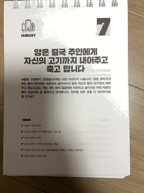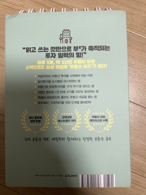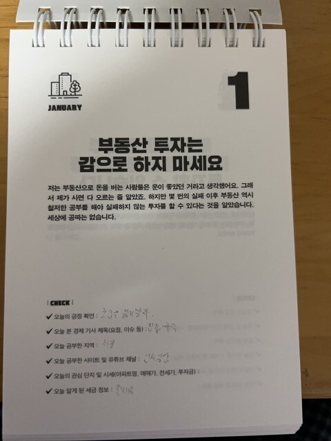 읽고 쓰는 것만으로 부(富)가 축적되는 투자 일력의 힘이 이 스프링 노트에 고스란히 묻어나있다. 달력이 아닌, 일력이라 365일의 내용이 담겨있을 것이다. 시중에 재테크 관련 도서가 넘쳐나는 건 사실이다. 그럼에도 불구하고, 형식이 복잡하거나 장황하지않고, 내용 자체도 하루에 하나씩만 설명하고 있기에 나는 색다르다는 인상을 많이 받았다. 학습이 두렵다거나, 시작하기 어려우면 이것으로 출발을 해보자. 단순히 내용을 주지시키거나 알게하는 것이 아니라, 지속적인 관심을 확장시키면서 알아서 스스로 보게끔 이끌어주고있다. 이 책이 모든 것을 100% 보장해주는 것은 아니지만, 살아가면서 부동산이나 재테크 등 관련으로 선택을 해야하는 순간이 여러 번 있을 것이다. 아마도 이것이 올바르고 현명한 선택으로 이끌어주지않을까? 그런 기대감을 가져본다. 매일 날짜를 확인하면서 성실하게 부동산 지식, 정보, 생활 전략, 인사이트들을 쌓다 보면, 이것이 거대한 부의 습관이 되고, 부의 증식으로 자연스럽게 이어지게 될 것이라 의심치않는다.