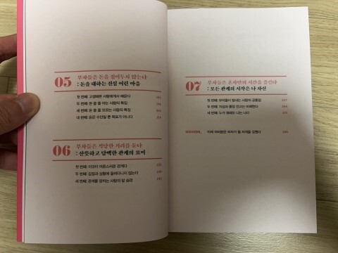 01 인간관계야말로 성공과 행복의 열쇠다 / 02 부자들은 특별한 눈을 가졌다 : 사소한 것에서 발견하는 됨됨이 / 03 부자들의 시간은 빠르게 흐른다 : 비교할 수 없는 최고의 자산, 시간 / 04 부자들은 스펙을 보지 않는다 : 사람을 평가하는 남다른 기준 / 05 부자들은 돈을 접어두지 않는다 : 돈을 대하는 진심 어린 마음 / 06 부자들은 적당한 거리를 둔다 : 산뜻하고 담백한 관계의 묘미 / 07 부자들은 혼자만의 시간을 즐긴다 : 모든 관계의 시작은 나 자신   총 7장으로 구성되며, 부자들이 어떻게 사람과의 관계를 두는지, 더 나아가서 인간관계를 어떻게 만들고 관리해야하는지? 를 배울 수 있는 소중한 시간과 기회를 갖게 될 것이라 믿어 의심치않는다.