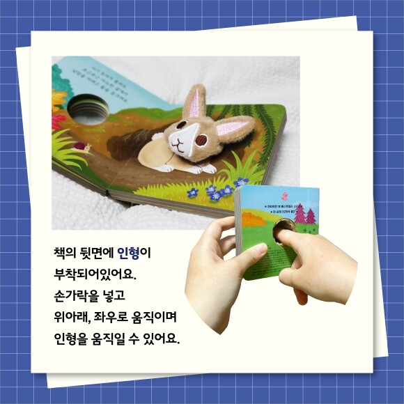 인형에 손가락을 끼우고 직접 움직이다보면 손가락 힘을 키우게되고 소근육 발달에 도움이 됩니다!