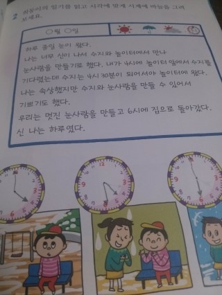 친구의 일기를 읽어보면서 시간에 맞게 시계바늘을 그려서
