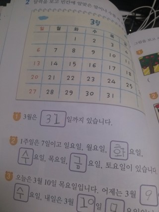 3월이란 달력을 가지고...요일과 날짜를 정확히 볼수 있는 파트도 구성되어 있다.