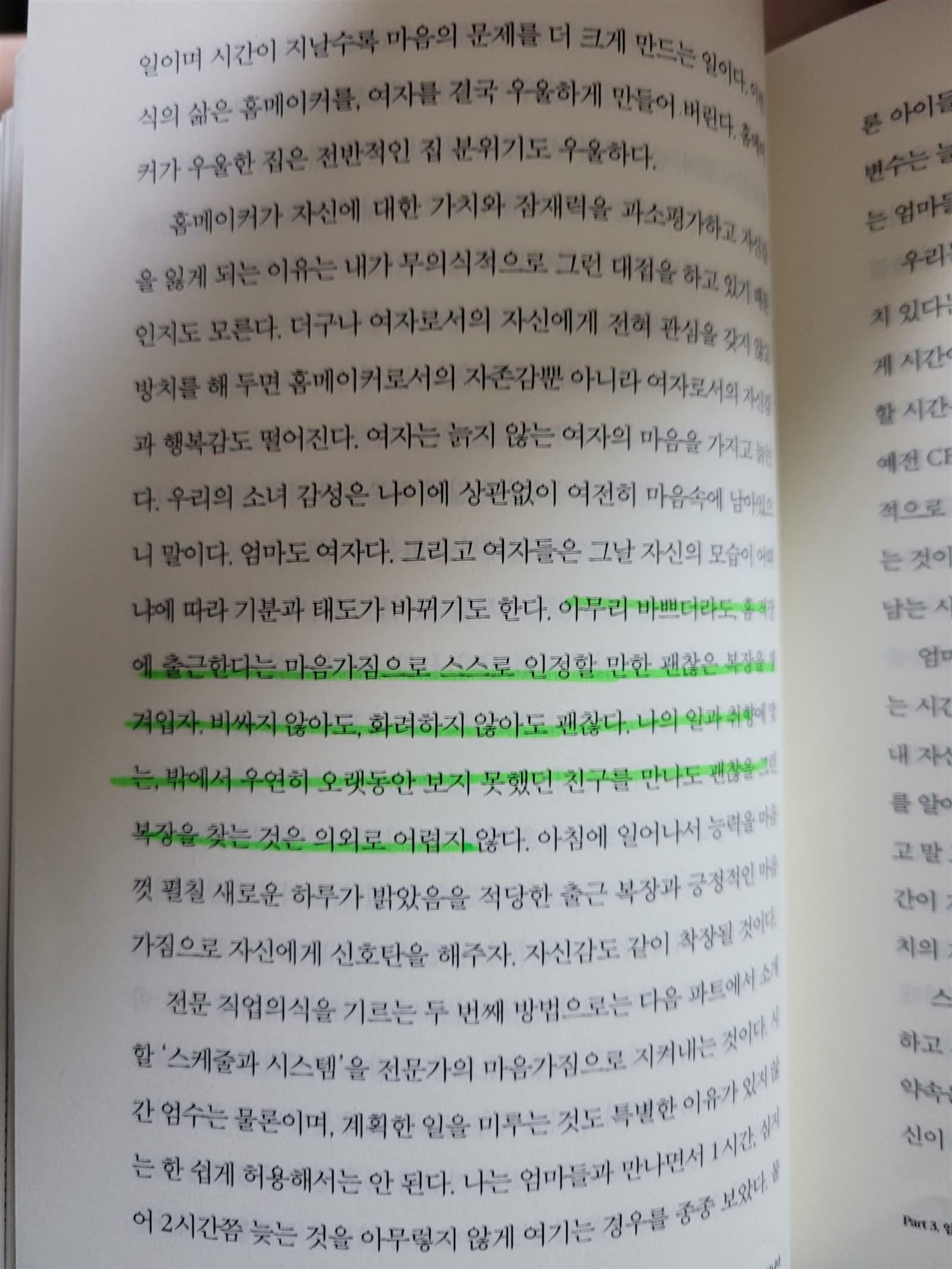 #나는홈메이커입니다 미국에서는 전업주부를 홈메이커라고 한다. 홈메이커의 홈은 집을 의미하는건 누구나 알것이다. 혹시 왜 하우스가 아닐지 의문을 갖는 사람이 있을까? 혹시 홈 이나 하우스나 하며 하우스메이커라고 말하는 사람이 있을지 몰라 남겨본다. 하우스는 단순히 집이라는 구조물을 의미하지만 홈은 그안에서 일어나는 보이지 않는 가치들도 포함된다. 그래서 주부를 일컫는 말은 하우스메이커가 아니라 홈메이커라고 일컫는다. 살다보면 한번쯤 사랑하는 사람을 만나면 가정을 일구고 싶은 마음이 생긴다. 하지만 취업을 한 첫날 회사에서 막막함을 느끼듯 육아도 첫날 막막함을 느낀다. 책에서 보던 걸 바로 실전에 투입한다. 애를 키우면서 한번씩 떠올리던 것이 있는데 어렸을때 나의 꿈은 '신사임당'같은 사람이 되는것이었다. 인생은 신념대로 흘러간다는 말을 들은적 있는데 그때 일을 떠올릴때마다 이것이 나의 숙명이구나 하곤 했었다. 그래서 p115를 읽고 많은 공감을 했다. 지금의 내 삶을 두고 행복이니 불행이니 이분법적으로 생각해본적은 없는데 쉬운 길이 아니라는것 만큼은 확실히 깨달았다. 책을 읽으면서 홈메이커도 프로페셔널이 요구된다는걸 깨달았다. 사실 몰랐던 것이 아닌데 페이가 없다보니 그런 부분에서 의기소침해 지는게 있었다. 언젠가 경력단절여성을 위한 프로그램에 갔더니 집에서 가사일을 하는 여성을 돌려까는 듯한 기분이 든적있다. 일하는 여성에게 꿈과 희망을 주기 위해 하는 멘트라 그런지 집에서 일하는 여성을 한심한 부엌떼기 취급하는것 같아서 답답했다. 주변에서 요즘 근황을 얘기하면 자기들은 야망이 커서 애를 보기 싫다고 한다. 누구는 하고 싶은 일이 없나? 선택과 집중이라고 지금은 집안을 바로 세우는게 더 중요해서 잠시 미룬것 뿐인데, 그게 뭐가 그리 한심한 일이라고. 친구와 그렇게 투닥거리고 해소되지 않은 무언가때문에 몇날며칠을 그일을 곱씹고 살았는데 이 책을 보고 마음이 풀렸다. p74에 delayed gratification이라는 단어가 나온다. 더 가치있는 보상과 결과를 위해 순간의 기쁨을 선택하지 않는것이라고 한다. 생각해보니 나는 전형적인 Delayed gratification형 인간이었다. 이런 내가 재미없는 인간이라고 주변에서는 치부해왔는데, 이런 내가 재미있다고 웃어주는 남편과 아이들이 있다는걸 내가 그동안 잊고 살았다. 내가 순간의 기쁨보다 가족을 선택하는 이유 여기있었네. 이 책은 나같은 Delayed gratification형 주부에게 강력히 추천한다. 주변의 쾌락주의자들이 한심한 사람으로 몰아넣더라도 웃으며 '그렇구나~~'라는 용기를 세워준다. 이 땅의 Delayed gratification형 주부들 화이팅! 본 도서는 #리뷰어스클럽 으로 부터 무료로 지원받아 지극히 주관적으로 #서평 을 작성하였습니다.