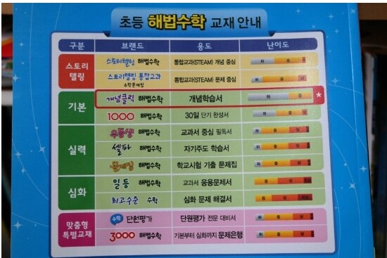 수학교재를 한눈에 알기 쉽게 정리한 표인데요