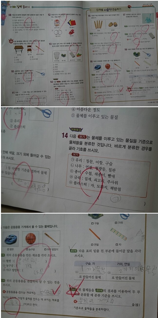 공책, 수첩, 색종이는 종이로 만들었으니까..물체를 이루고 있는 물질이 정답이 되겠지요.