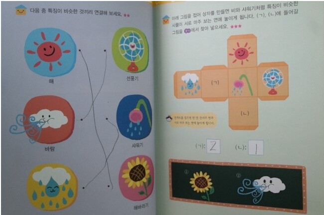 정육면체 전개도에 들어 갈 비슷한 특징 그림 찾기도 합니다.