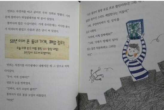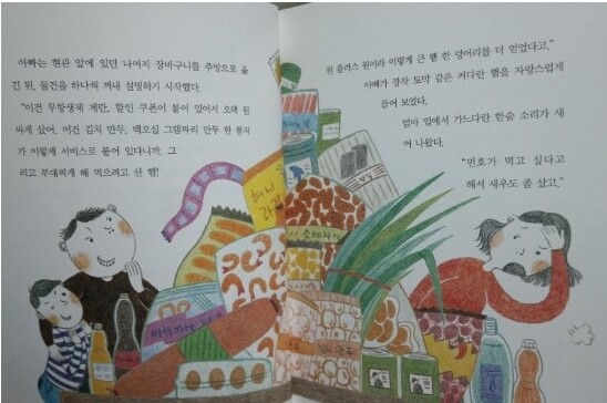 아빠와 민호는 늘 거침없이 물건들을 넘치도록 가득 담아 장을 봐온답니다.