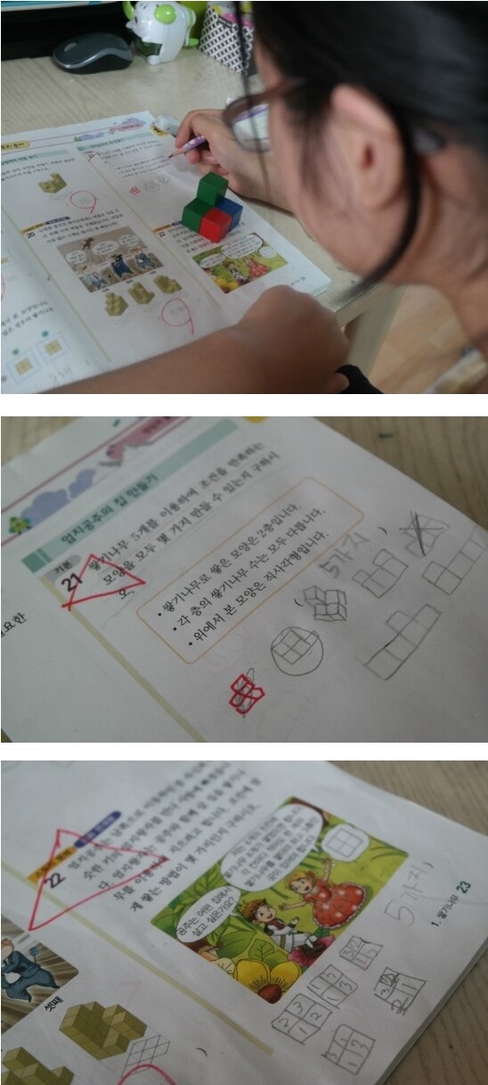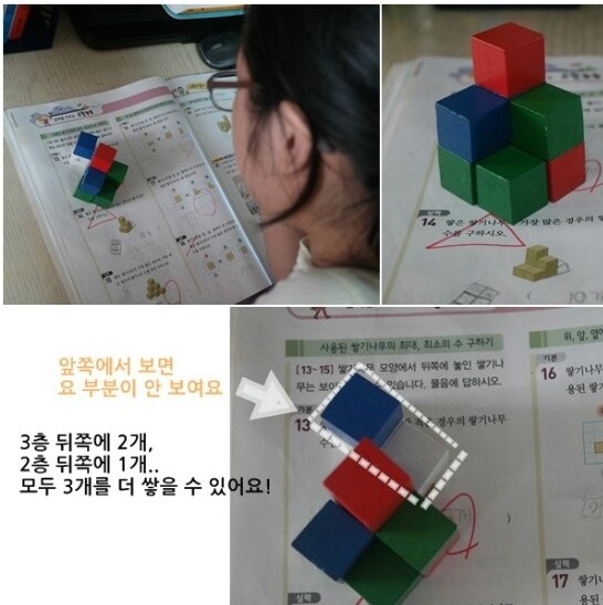 ​딸램은 조건에 알맞게 쌓기나무를 직접 놓아보면서 방법을 찾아갔어요.