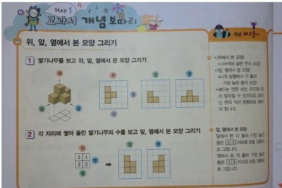 기본적으로 사용된 쌓기나무 수에서부터 위, 옆, 앞에서 본 모양그리기,