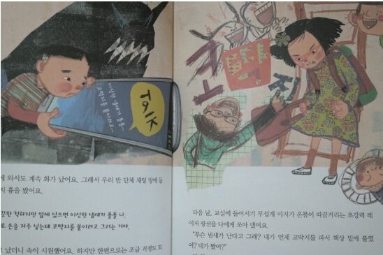 파리채를 든 무서운 선생님과 ​파리처럼 싹싹 빌고 있는 형진, 그리고
