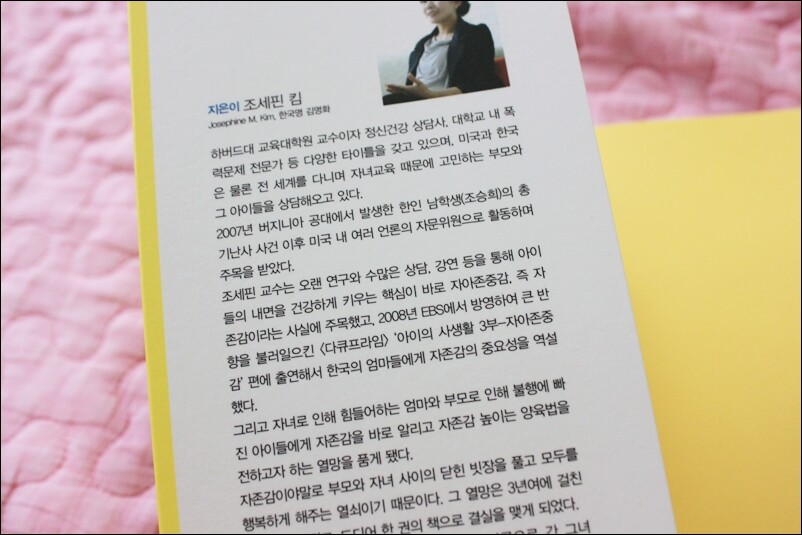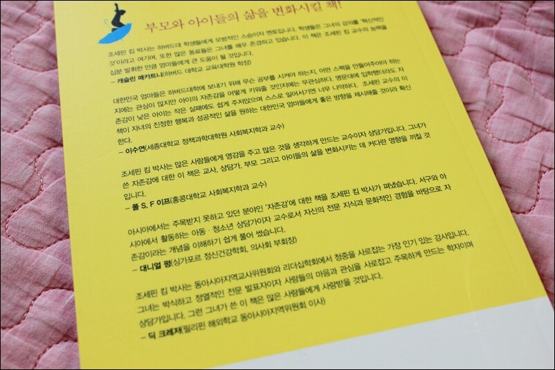 육아서를 읽을 때마다 드는 생각! 반성, 그리고 엄마는 피곤하구나라는 생각! 엄마의 스트레스나 엄마의 피곤은 어찌 해야 하는걸까? 무조건 부모니 참아야 하는 걸까? 물론 육아서를 읽고 나면 우리 아이를 더 잘 키울 수 있도록 도와 주는 것은 맞지만 그리고 사실 도움도 많이 되고... 하지만 그럴 수록 엄마는 너무 피곤하다. 그 악순환을 반복하며 아이가 크고 엄마도 크는 거겠지요? 우리 아이 자존감의 비밀을 읽고 나서 또 한번 아~ 반성! 물론 늘 부족한 엄마이지만 육아서를 보고 나면 더 드는 반성! 앞으로 노력하자하고 다짐하며 책을 덮었답니다. ^^ ebs에서도 나오셔서 좋은 이야기를 들려 주셨다고 하는데... 전 안타깝게도 그 방송은 보지 못했답니다. 하지만 책을 읽는 내내 나도 그 방송을 봤었으면 좋았겠구나 싶더라고요. 책에서도 물론 아이의 자존감을 키워주는 방법이 잘 안내가 되어 있었지만 왠지 그것으로는 오롯이 와 닿지 않더라고요. 방송이라면 더 편하게 더 쉽게 알지 않았을까 싶더라고요. 우리 나라 엄마들이라면 아이들이 하버드대에 가길 소망합니다. 대단한 영광이지요. 세계적으로 인재들만 모인다는 하버드이니까요. 그 하버드대 교육학과에서 교수로 있으시다니 더없이 대단해 보이십니다. 그것도 한국 분이요. 책을 읽으면서 나도 모르게 아이의 자존감을 많이 떨어 뜨렸구나 싶었답니다. 무심코 한 말에 아이의 자존감이 무너지고 떨어졌다니... 그 점을 우선 반성... 또 알고보니 엄마의 자존감이 높아야 아이의 자존감도 높다는 사실! 그러고 보니 저도 자존심만 쎈듯 싶고 자존감은 높지 않은듯 싶더라고요. 자존심과 자존감은 조금 다르다고 하네요. 자존심: 남에게 굽히지 아니하고 자신의 품위를 스스로 지키는 마음. 자존감: 자신의 품위를 스스로 지키지만 자존심에 비해 자존감이 높다면 상처를 덜 받는다고 하네요. 보기엔 같아 보이죠? 하지만 책을 읽으면 읽을 수록 두 개념의 차이가 확실히 다르다는 것을 알았답니다. 이분이 했던 방송도 다시 보기를 통해서 챙겨 봐야겠다 싶었답니다. 그리고 앞으로도 좋은 육아서를 많이 써주시길 바래봅니다. 지난번 강의를 놓친 것이 참으로 후회가 되더라고요. ^^