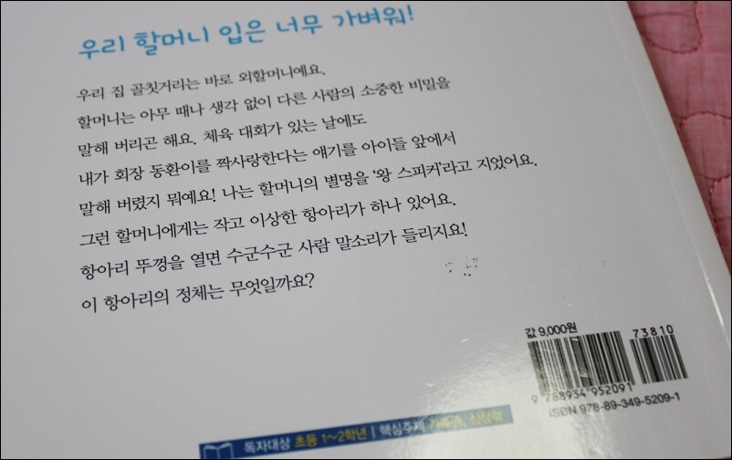 요즘 누구나 인터넷을 이용하지 않는 분들은 없을 거에요. 우리 아이들의 경우 더욱 그러하지요. 요즘엔 학교마다 숙제도 인터넷 홈페이지에 등록하는 곳도 생길 정도니까요. 하지만 이렇게 편리한 인터넷이 자칫 잘못하면 남에게 상처를 줄 수도 있단 사실 알고 계시죠? 무심코 단 댓글 때문에 남이 상처를 받아서 간혹 불미스러운 일도 일어 나는 요즘이니까요. 악성댓글은 정말 문제입니다. 미리부터 우리 아이들에게 교육을 시켜 둔다면 미래의 우리 아이들은 댓글 한줄 남길 때에도 좀더 신중해 지지 않을까요? 이번 할머니는 왕 스피커를 보면서 더욱더 조심해야 겠다고 생각했답니다. 이제 막 인터넷을 시작한 우리 아이에게는 미리부터 댓글 하나, 친구에게 하는 말 한마디 모두 신중하게 한번 더 생각하고 하라고 가르쳐야겠단 생각이 들었답니다. 할머니 중에는 왕스피커라는 말처럼 수다스러운 할머니가 있습니다. 쉴새없이 소문을 몰고 다니는 분이 있으시죠? 그런가 하면 그냥 유쾌한 수다를 풀어 놓으시는 분도 있으십니다. 또 남들이 듣기 싫은 말을 마구 하는 욕쟁이 할머니도 있으시고요. 하지만 할머니는 왕 스피커에 나오는 할머니는 그냥 수다스러운 할머니랍니다. 그것도 나름 이유가 있는 수다이지요. ^^ 이번 책의 적정 레벨은 초등 1학년에서 2학년이랍니다. 핵심 주제는 가족애와 상상력입니다. 주니어 김영사의 책들은 독자대상과 핵심 주제가 있어서 더없이 좋더라고요. 책을 읽고 나서 와~ 정말 유쾌하게 풀어 내시는 분이구나 싶었습니다. 너무 재밌었답니다. 우리 아이가 책을 서너번 봤을 정도이지요. ^^ 그리고 너무 좋아 하더라고요. 이 작가분의 다른 책들도 찾아서 봐야겠어요. 학교 운동회, 저도 내년이면 학부형이니 운동회를 직접 볼 수 있겠네요. 저희 어릴 적에는 운동회하면 정말 큰 행사였는데 말이죠. 저희 아빠도 운동회 만큼은 하던 일을 하루 쉬시고는 운동회에 오시곤 하셨답니다. 동네 작은 잔치였어요. 같은 동네 사는 사람끼리 음식도 나눠 싸와 나눠먹고 응원하고 했거든요. 운동회 끝나면 뒤풀이도 같이 한 집에 모여서 하고요. ^^ 그때가 왠지 그립습니다. 아이고 윤서가 창피할만 할듯 싶어요. 할머니가 아이들이 있는데서 큰 소리로 동환이와 윤서가 커서 결혼한다고 말해 버렸거든요. 물론 할머니가 악의는 없이 하신 말씀이지만 요즘엔 워낙 예민한 아이들이 많고 아이들이 놀릴 수 있으니 이런 이야기는 삼가는 것이 좋을듯 싶어요. 만약 이런 할머니가 있다면 미리 엄마가 말씀을 드려 놓는 것도 좋겠죠? 할머니에게 화가난 윤서가 할머니의 소중한 항아리 뚜껑을 깨버렸답니다. 그리곤 양심에 찔려서는 이렇게 이불 속에 숨었어요. 하지만 이런 행동은 좋지 못하다는 거 알고 있죠? 아무리 잘못한게 있어도 바로 용서를 구해야 한답니다. 우리 아이들에게도 이런 사실을 미리 알려주시면 좋을듯 싶어요. 물론 바로 잘못을 시인하고 용서를 구하는 아이들이 드물긴 하겠지만요. 엄마가 먼저 마음을 열어야 할 듯 싶어요. 이런 점에선 저도 반성을 해야겠어요. 학교에 소문이 자자하자 동환이는 윤서에게 절교를 선언했답니다. 이런... 아무리 그래도 그렇지 절교까지야... 윤서가 정말 상처를 받았겠네요. 말은 역시 함부로 뱉어 내는 것이 아님을 아이들에게 미리 말해주어야겠어요. 내 말로 인해서 상대방이 상처를 받을 수도 있으니까요. 한번 뱉은 말은 주어 담을 수 없다는 사실과 함께요. 할머니 역시 곤란하기는 마찬가지입니다. 그간 할머니가 혼자서만 했던 말들이 돌고 돌아서 곤란한 지경에 이르렀거든요. 역시 소문은 천리를 간다는 옛말처럼 누구의 말이든 신중하게 해야한답니다. 소문을 내는 사람은 좋지 못해요. 어느날 학교 게시판에 올라온 동환이의 글을 보고 친구들이 댓글을 달았답니다. 동환이의 글도 신중하지 못했지만 댓글을 단 친구들의 글도 심하다 싶습니다. 요즘 인터넷이 너무 발달했으니 이런 일은 더욱 많아졌답니다. 우리 아이들에게 상대방의 마음은 어떤지 바꿔 생각해 보게 한후 이런 행동은 좋지 못하며 신중하게 생각하고 댓글을 달아야 한다고 알려주었음 좋겠어요. 미리 부터 부모가 이런 교육도 해주신다면 악풀을 다는 사람은 덜 나올 테니까요. 윤서는 할머니의 항아리 여행을 다녀온 후에 할머니를 찾아서 용서를 구했답니다. 늦게라도 자신의 잘못을 인정한 윤서의 모습 너무 이쁩니다. 윤서의 마음이 변하면서 모든 골치아픈 문제들이 해결되었습니다. 그리고 이제 더는 학교 게시판에서 나쁜 글들은 볼 수가 없답니다. 또한 윤서 할머니도 더이상은 아프지 않으실거에요. 우리 아이들에게 미리부터 댓글을 달 땐 한번 더 생각하고 달아야 한다는 사실을 알려주세요. 쉽게 아무 생각 없이 남긴 한줄의 댓글이 상대방에게는 아주 큰 상처가 될 수도 있으니까요. 미리부터 엄마들이 교육 시켜 둔다면 미래에 악풀을 다는 사람은 되지 않을듯 싶습니다.