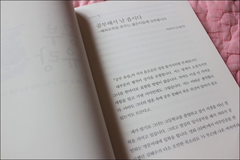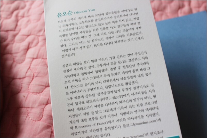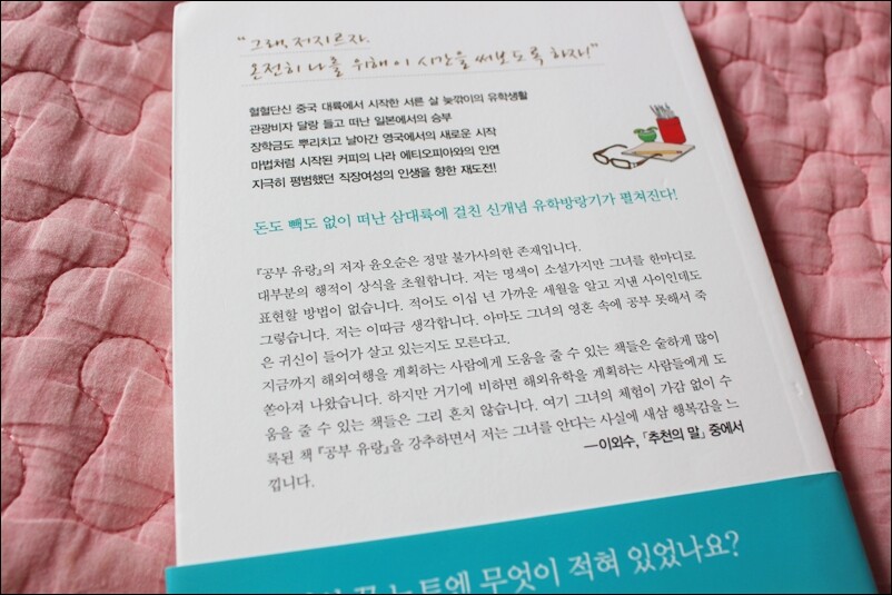 학교를 다닐 땐 졸업만 하면 무조건 좋을 줄만 알았는데... 사회생활하고, 아이 엄마가 된 지금은 왜 그때 열심히 공부를 안했을까라는 후회가 남는다. 기회만 된다면 다시 시작하고 싶다는 생각이 스멀스멀 드는 것을 보면 지금도 늦지 않았다고 생각하고 다시 나도 해볼까 싶은 생각이 든답니다. 30살에 도전하셔서 현재까지 십년째 공부유랑을 하시고 있으시다네요. 암튼 정말 부럽습니다. 그리고 응원드립니다. 띠지를 보고서 두분이 같은 형제인줄 알았어요. 왠지 비슷하게 보여서요. ^^ 근데 오랜 지인관계라고 하시네요. 저만 그런지는 모르지만 닮아 보여요. 이외수 작가분이 추천사도 있더라고요. 이외수씨의 추천사도 그렇지만 저도 이 책을 읽고 나서 와~ 대단하구나 싶었어요. 진짜 공부에 한이 맺히신 분 같아요. 그리고 돈도 없으시다면서 대단하세요. 직업도 다양하고, 공부도 정말 다양하게 하시더라고요. 어찌 이런 공부들을 할 수 있었는지... 대단할 뿐입니다. 여유롭게 공부할 수도 없었다는데... 아르바이트에 장학금 받으면서 유학을 하시다니... 남들은 상상도 할 수 없는 일입니다. 지금도 외국 어디선가 공부하고 계실 작가분을 응원합니다. 추천사가 정말 웃겨요. 공부해서 남 줍시다... 부디 얼른 공부 끝내고 오셔서 한국을 빛내주세요... ^^ 저도 동감입니다. 용기가 대단하십니다. 다른 사람 같으면 그냥 나도 할 수 있을까? 하고 싶다라고 생각만 그칠 텐데... 그걸 실천하셨다니 대단하세요. 그리고 부럽습니다. 어디서 그런 용기가 생기신 건지요. 배움에 대한 열정은 못 말리는 것 같습니다. 다니던 직장을 그만두고 과감히 떠날 수 있었던 그녀의 용기... 대단합니다. 저라면 못했을 거에요. 그게 십년이라니... 더욱 대단하십니다. 공부 하시기가 힘드셨다는데도 어쩜 그리 오랜 시간동안 공부를 하실 수 있었는지요. 그저 한없이 부러울 따름입니다. 중국, 일본, 영국을 돌아다니면서 공부에 대한 열망이 대단하십니다. 한군데 유학 하기도 힘들텐데. 3군데나 다니시다니요. 남들이라면 도전해 볼 수 없었을 겁니다. 하지만 그녀이기에 가능했던건 아닌가 싶기도합니다. 공부 귀신이 붙었을까요? ^^ 3군데 유학을 다니며 나름 생긴 노하우, 방법, 팁 같은 것을 정리해 두어 처음 유학을 떠나시는 분들께 많은 도움이 될 듯 싶습니다. 또한 유학을 떠나고 싶으나 용기가 없어서 못 떠나시는 분들께는 다른 곳의 정보를 볼 수 있는 기회가 되기도 하고요. 멋진 공부 이야기를 들으면서 저도 왠지 모르게 떠나서 공부를 하고 싶다는 생각이 들기도 했답니다. 그녀처럼 잘 할 자신은 없지만 그래도 공부엔 나이가 없구나 하는 생각은 들었습니다. 나이를 먹으면서 공부라는 것과는 멀어졌구나 싶기도 했고, 이젠 늦은거야라는 생각이 들때도 있었는데... 그녀를 보니 그런 말도 핑계에 지나지 않겠구나 싶더라고요. 자신의 삶을 자신이 개척하는 것 또한 멋져 보였습니다. 책에는 그간 공부하며 힘들었던 순간들, 포기하고 싶었던 순간들이 있었지만 제가 보기엔 그런 것들이 그녀를 더욱 단단하게 만든 것은 아닐지 생각해 보았습니다. 그리고 주변에서 많이 도움을 주었던 사람들... 사람운도 참 좋은 분이구나 싶기도 했고요. 하긴 어디서든지 열심히 하는 사람은 돕는 사람이 생기는 건 당연한 것일지도 모르겠어요. 지금도 저 멀리 타국에서 열심히 공부하고 있을 그녀에게 박수를 보냅니다. 그리고 어서 돌아와 그 배움을 한국에서 필요한 인재로 거듭나시길 바랍니다.
