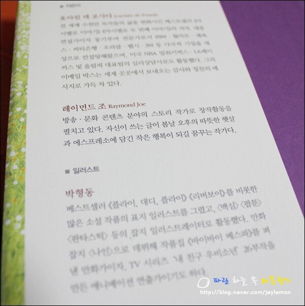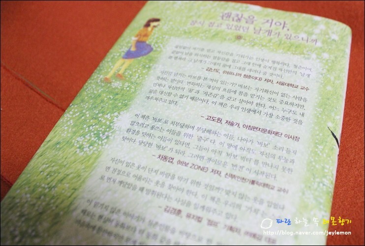 책 내용과 상관없이 책 표지를 보고서 이 책은 왠지 마음을 편안하게 해주는 책일 것 같은 느낌을 받았답니다.
